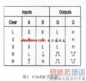 CD4528含两个单稳态触发器,其真值表如图1.芯片3脚与13脚分别为其内部两个独立单稳态电路的Clear端,5脚和11脚为单稳态的B输入端,4脚与12脚为单稳态的A输入端。B端接高电平,只有当Clear端为高电平时,A端输入的上升沿触发才会有效。