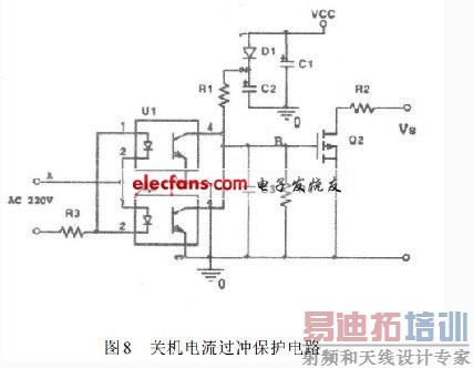 图8 为关机电流过冲保护电路,该电路能在3ms内迅速检测出交流电源是否关闭,并且在电源关闭后强行将调节器给定输入端的电压拉低,防止电流过冲,具体动作过程如下。