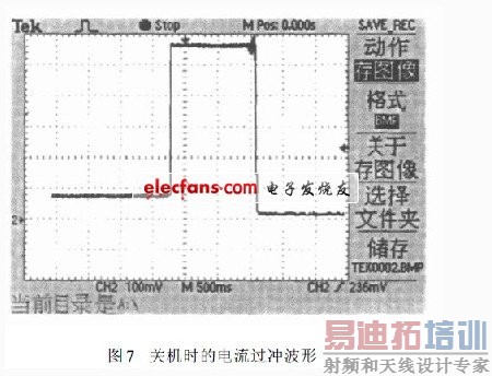 在我们设计的30A/20V开关型稳流电源中,采用控制电路单独供电。主电路的滤波电容在工作时存储了大量的电能,切断总电源后,其中存储的电荷持续数秒才能放完。 所以关机后单独供电的采样电路先关而主电路延迟关闭。调节器的给定输入端由主电路供电,即关机后调节器的采样输入端先降低,给定端缓慢降低,于是其输出误差电压增大,控制芯片增加PWM 的占空比,由此导致了关机时负载电流的严重过冲,过冲时的电流波形如图7所示。