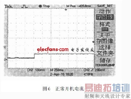 开机时,由于电源滤波电容大,以及各延迟环节使得电流采样反馈值与给定值在调节器输入端不同,这会使得负载电流上升过冲,实测过冲波形如图5所示。 为了解决这一问题,可以将调节器给定端RC 的值适当加大,调节以后的开机电流没有发生过冲,波形如图6.