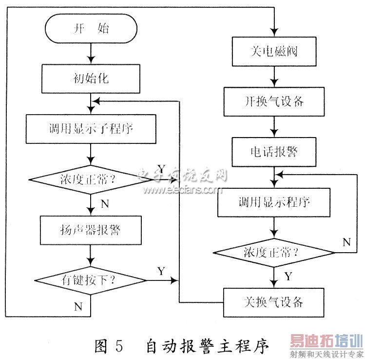 主程序的主要功能是实现报警和本地控制。采用循环结构,顺序查询各个报警输入端口和控制输入端口,当有某报警信号或控制信号输入时,程序转到相应的程序段运行,运行完毕后又进入循环。流程图如图5所示。