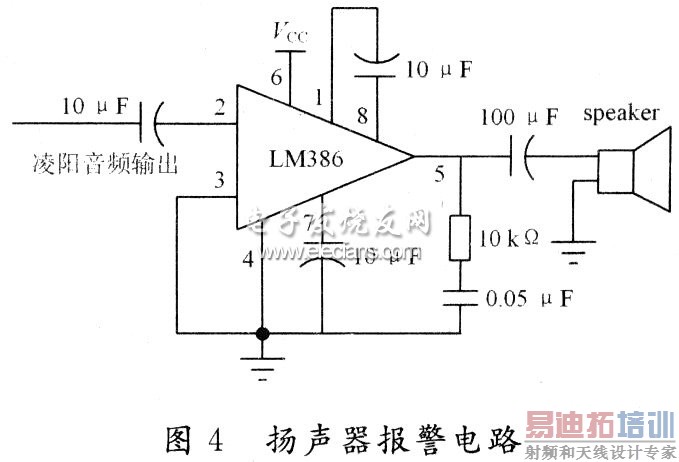 采用音频功率放大器LM386对凌阳单片机输出的语音信号进行放大,驱动扬声器报警。扬声器报警电路如图4所示。