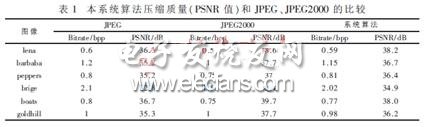 表1为本系统采用算法与JPEG及JPEG2000对标准图像压缩后重建图像的PSNR比较。从表中可以看出,本系统采用算法远优于JPEG,接近JPEG2000。PSNR值的比较以压缩比(对应表中Bitrate)为基准,即在相同压缩比的情况下对比PSNR值。