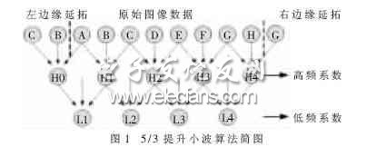在新的图像压缩标准JPEG2000中,采用9/7、5/3提升小波变换作为编码算法,其中5/3小波变换是一种可逆的整数变换,可以实现无损或有损的图像压缩。在通用的DSP芯片上实现该算法具有很好的可扩展性、可升级性与易维护性。用这种方式灵活性强,完全能满足各种处理需求。