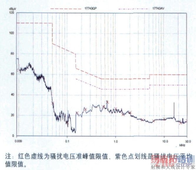 B. 频率为30 MHz ~ 300 MHz范围内辐射电磁骚扰本次测试是采用CDN法测试,限值应符合GB 17743-2007的相应要求,测试结果见图7。