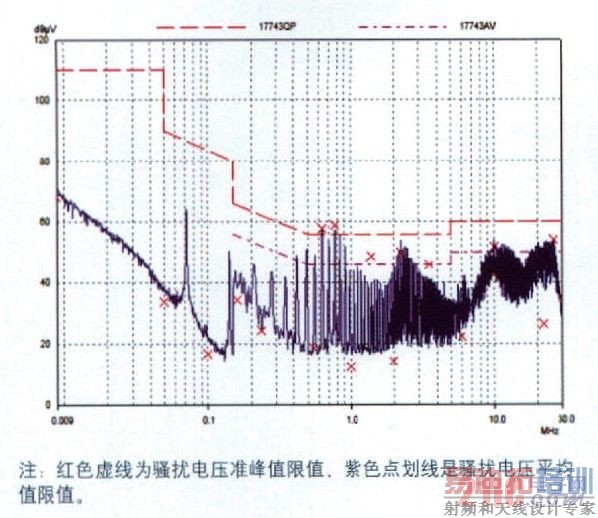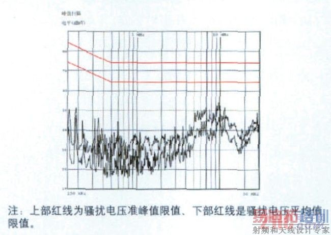 图21 电源端频率为9 kHz ~30 MHz范围内传导骚扰电压(准峰值)