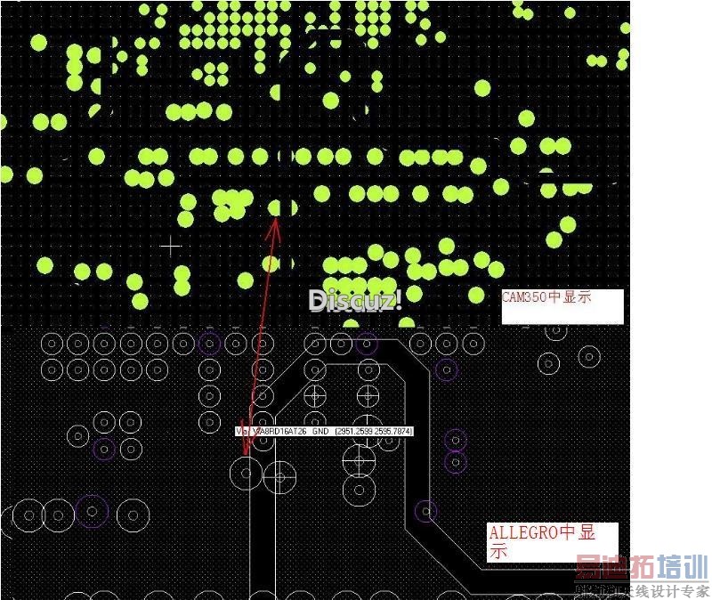 如果分隔带 正好经过 过孔,结果 allegro导出 的gerber ,再导入CAM350 就悲剧了,如图,