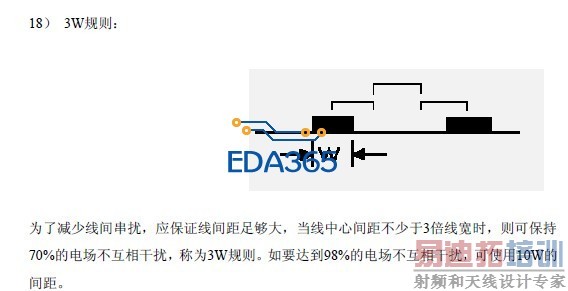 这里3W是线与线之间的距离保持3倍线宽。你说3H也可以。但是这里H指的是线宽度。不是介质厚度。是为了减少线间串扰,应保证线间距足够大,如果线中心距不少于3倍线宽时,则可保持70%的线间电场不互相干扰,称为3W规则。如要达到98%的电场不互相干扰,可使用10W规则。针对EMI