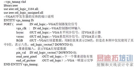 本文采用型号Optrex 16027的LCD屏,头文件pio_lcd16027.h定义了九个控制子程序,通过这些程序完成对LCD的控制。标准VGA画面大小是640*480,每秒60帧左右。像素时钟高达25.175MHZ。如果每个点都由Nios软件扫描实现,那么在40ns的间隔内,最多能让共作在50MHZ的CPU执行两条指令。所以,我们采用DMA控制器在流模式VGA控制器和SRAM之间建立一条DMA传送通道,让硬件完成像素信息的自动读取,缓解了CPU的工作压力。VGA时序发生器的设计源程序由VHDL语言实现,下面是部分示意代码: