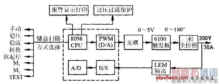 系统的另一个特点是通用触发板的使用。它介于计算机PI调节器与晶闸管主电路之间,作为一个很好的缓冲界面,能保证调节失控时系统的安全可靠。另一方面,8098单片机的WATCHDOG也强化了系统的抗干扰能力,使得该系统非常适用于现场控制。