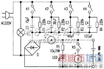 图中,L为220V交流电源指示灯,R1、R2、R3、R4分别是电容器C1、C2、C3、C4的泄放电阻,在不用充电器时,能及时将电容器上积存的电荷放掉;K1、K2、K3、K4是支路控制开关,通过开关通断控制可以决定支路是否并入电路;R5、LED组成空载报警指示电路(为了安全,充电器不可在空载状态下插入220V交流电源),LED亮时,说明空载。电流表A指示充电电流的大小:电压表V指示蓄电池两端的电压(为防止空载时电压高烧坏电压表,电压表的接入与否受开关K5的控制)。
