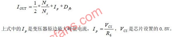 系统的恒流设计原理是通过设置Primary Side的峰值电流为恒定值,芯片的CS pin在恒流工作模式时,会被固定在最大值0.8V,0.8V除以R6的值就能将变压器的原边最大峰值电流设置在要求值,变压器两边之间的电流比等于匝数的反比,再乘以反激时的占空比就能得到一个恒定的输出电流。