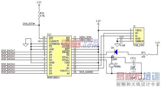 PDIUSBD12是一款带并行总线的 USB 接口器件,它符合通用串行总线 USB 1.1 版规范,集成了 SIE、FIFO、存储器收发器以及电压调整器等,可与任何外部微控制器或微处理器实现高速并行接口 2M字节/秒,且在批量模式和同步模式下均可实现 1M字节/秒的数据传输速率,可通过软件控制与 USB 的连接,采用 GoodLink技术的连接指示器 ,在通讯时使 LED 闪烁,具有可编程的时钟频率输出,内部上电复位和低电压复位电路,为双电源操作,在 3.3±0.3V或扩展的 5V电源下均可使用,可实现多中断模式的批量和同步传输。连接图如图 4: