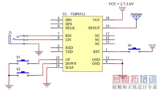 上图的参考设计是基于VMR6512独立工作模式的设计。其中S1和S2分别用于调整频率升高和降低。S3用于整个模块的Reset。天线采用75cm长度的导线会获得比较好的效果。