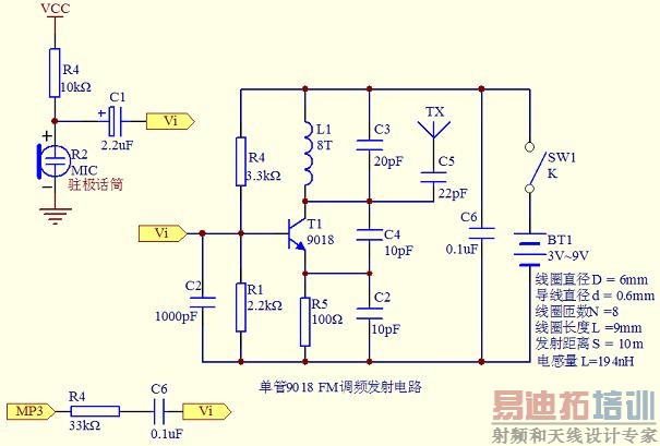 无线FM音频转发器可以将音频信号调制成高频信号,在一定距离内用调频收音机进行接收。无线音频转发器被大量地应用于无线耳机、车载MP3转发器、会议广播、楼宇及公园广播等地方。最简单的无线音频转发器可以只用一个三极管构成,如下图所示: