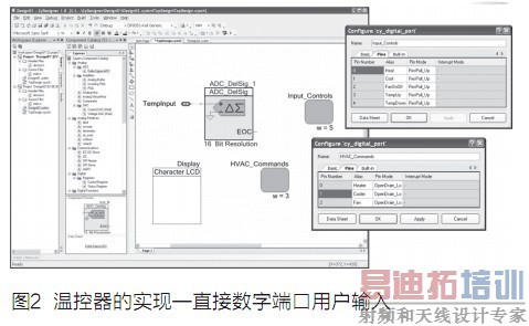 让我们以两个不同的实现例子验证这个论点:一个用于墙恒温器,另一个是显卡上的温度控制子系统。首先对于墙恒温器,如图2所示,假定使用基于8051的赛普拉斯PSoC3设备。“温度传感器”部分的硬件由连接到ADC(16位Δ-Σ转换器)的热敏电阻组成。“用户输入”部分的硬件由5个常开按键开关组成,一边连接到电路接地端,另一边连接到含内部上拉电阻的5输入数字端口。“热和冷命令”模块的硬件部分包括三个功率场效应管,由配置为开漏低输出的3输出端口驱动。最后,“显示输出”块的硬件实现是串行字符液晶显示器,能够根据需要显示字母数字字符串。