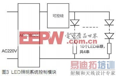 我们将400个LED分10组,每组40个。每组采用一个AP-28320作为电流源,用单片机控制可控硅的输出来调节LED的发光亮度。可在可控硅两端并联阻容吸收回路,用来吸收AP-28320与可控硅产生的谐波干扰。连接方式如图3。我们采用1W的白光LED,发光效率601m/W,预计室内亮度在2001x左右。