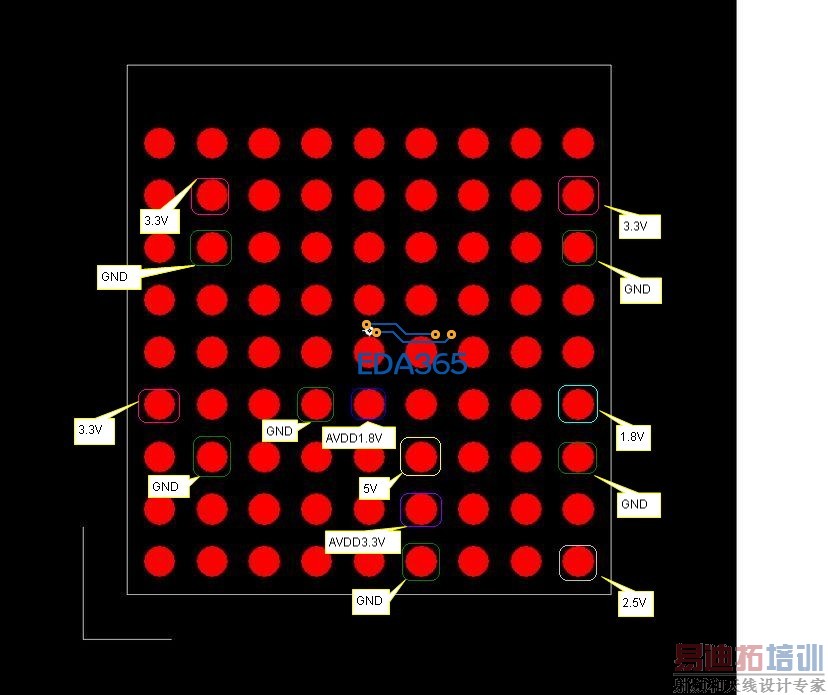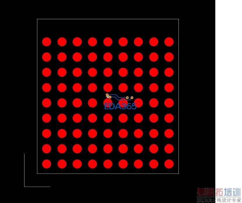 第一排和第二排用线引出,第三排,第四排,第五排打盘中孔,4mil的孔径,10mil的盘径。