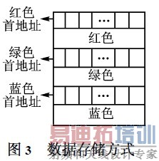 可将红、绿、蓝3种颜色对应的数据分开存储,以方便操作。数据存储方式如图3所示。同一种颜色的数据集中存放在某个区域中,区域的首地址作为该颜色的基址。在进行数据存放时,每个像素点只需给出相对变化地址(变址),加上不同颜色的基址就可以在3个区域中找到对应点的视频数据。