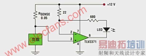 电路分析非常简单。22欧电阻两端的电压与RSENSE两端的电压相同。流过22欧电阻的电流与流过LED的电流相同。因此,对于图中给出的参数值,LED电流等于负载电流的0.05/22。当负载电流从200mA变化到6.6A时,LED从微弱发光变化到满亮度(受限于680欧电阻)。