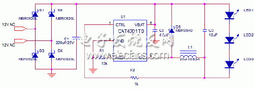 在电路配置方面,VBAT的额定电压为-0.3至+40 V,因此整流桥上的输入电压高达24 Vac也是安全的。要保持较高输入电压水平就需要一个大容量的C1。大幅波动的经整流的AC电流将在双倍AC线路频率条件下把输出电流拉至零,因此减少了输出电流。220 μF的电容对这个设计已经足够了。对于12 Vac输入,C1额定电压应该是25 V。由于需要较低的正向电压,整流桥选用了MBR0520L表面贴装肖特基二极管。