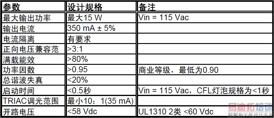 确定了基本设计要求,就需要考虑与终端应用需求有关的其它系统因素。例如,虽然标准中并无要求,但兼容已有线路调光方案很重要。因此,应当针对三端双向可控硅开关器件(TRIAC)壁式调光器来优化设计。TRIAC调光的挑战不少,但有一项因素设计人员可能容易忽略,就是驱动器应当能够能在低斩波(chopped)交流输入波形条件下启动及工作。而且,驱动电源的尺寸应当匹配嵌灯灯具接线盒。还应该注意一项人的因素要求。虽然LED实际上在瞬间之间就发光,但驱动器的设计要留出特定的启动时间。不管是什么LED灯具,这方面的表现都应该不比CFL差,甚至应该更好。所以,我们可以把CFL作为参照基准。“能源之星”CFL灯泡要求中,额定条件下最大启动时间为1秒,因此,我们将就LED驱动器在启动时间方面的设计目标定在0.5秒。由于这个设计面向住宅或商业应用,因此我们定下的规格目标更具挑战性。表2总结了本GreenPoint®参考设计关键的设计目标。