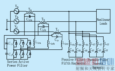 在配电系统中,传统的谐波抑制和无功补偿方法是将无源电力滤波器与需补偿的非线性负荷并联,为谐波提供一个低阻通路的同时,也提供负载所需的无功功率,这是最常见和实用的方法。该装置利用电感和电容器贮能元件。根据谐振原理,通过滤波电路对需要消除的高次谐波进行调谐,使之发生谐振。以便其在谐振时得到阻抗最小的特性,有效消除指定次数的谐波,并在谐波源附件就地吸收谐波电流,从而不使其注入电网中去。该装置的优点是投资少、效率高、结构简单。运行可靠及维护方便,运行费用也低,不但起到滤波作用,还能进行无功补偿。因此,无源滤波器是目前广泛采用的抑制谐波及无功补偿的重要手段。但该方法的补偿特性受电网阻抗、频率和运行工况的影响,只能起到对某几次固定频率谐波的抑制效果,而很可能对其它次谐波有放大作用,使滤波器过载甚至烧毁。另外,LC滤波电路会因系统阻抗参数变化而产生与系统并联谐振问题,影响和后果严重。