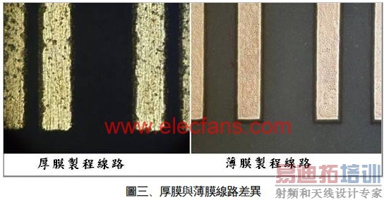 薄膜技术的导入正可解决上述线路尺寸缩小的工艺瓶颈,结合高真空镀膜技术与黄光微影技术,能将线路图形尺寸大幅缩小,并且可同时符合精准的线路对位要求,其各单元的图形尺寸的低差异性(高均匀性)更是传统网版印刷所不易达到的结果。在高热导的要求下,目前璦司柏(ICP)的薄膜工艺技术已能克服现阶段厚膜工艺在对位精准度的瓶颈,图(二)即为薄膜工艺之简易流程图,在空白陶瓷基板上(氧化铝/氮化铝)经过前处理之后,镀上种子层(sputtering),经过光阻披覆、曝光显影,再将所需之线路增厚(电镀/化学镀),最后经过去膜、蚀刻步骤使线路成形,此工艺所备制之产品具有较高的线路精确度与较佳的金属镀层表面平整度。图(三)即为璦司柏薄膜基板产品与传统厚膜产品的金属线路光学显微图像。可明显看出厚膜印刷之线路,其表面具有明显的坑洞且线条的平整度不佳,反观以薄膜工艺制备之金属线路,不但色泽清晰且线条笔直平整。