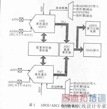 模/数转换接口由2路16位逐次逼近式ADC、集成采样保持器、一个可编程窗口检测器、一个DMA接口组成。ADC0/ADC1可配置成单端或差分输入方式。模/数转换的工作方式,窗口检测器和DMA接口均可通过特殊功能寄存器由软件控制,模/数转换器及其采样保持电路也可通过特殊功能寄存器单独设置,如图1所示。显然,转换启动方式灵活,软件事件、外部硬件信号和周期性的定时溢出都能用作触发信号,转换结束后,16位的结果锁存在SFR中,可由DMA接口将其存入片内或片外RAM。