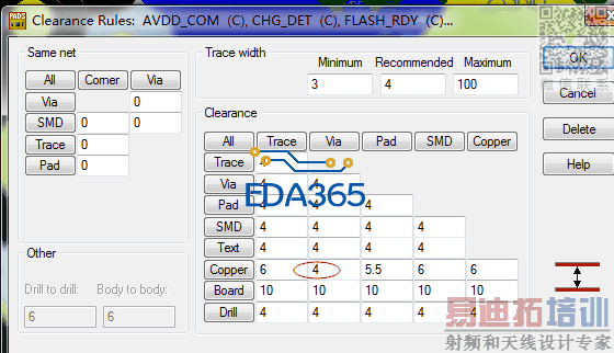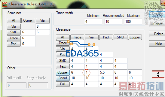 画图软件是pads 9.5版本,设置BGA里面部分信号线以及地线与过孔之间的距离为4mil,铺铜后地线与过孔之间的距离比原有设置偏大,信号线与过孔之间的距离与设置一致.