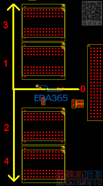如果一定要走T型拓扑的话,1和3中间做个T点,2和4中间做个T点,再在1和2中间放个T点,由于PADS没办法PINPAIRS的长度测量(传说中9.5有?),建议你4片DDR3的布局相对于BGA的中心对齐,尽量保证1和3之间关于T点对称,2和4之间关于T点对称。再有就是4片DDR离BGA的距离不要太过远了。