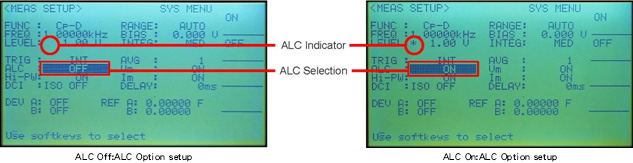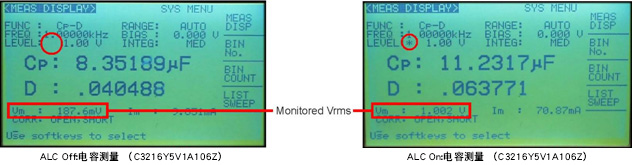 下图展示了ALC on和off之间的差异。当ALC功能off时,电容器上的实际电压约为1.0Vrms设定电压的10%。当ALC功能on时,电容器上的电压几乎是设定电压的100%。HP4284A具有电压和电流等级监视器,但还是可以使用伏特计验证实际电压。