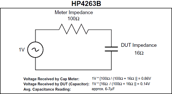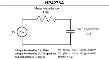 当从测试设备中将1.0 Vrms应加到电容器时,电压在仪表阻抗和电容器阻抗之间被分圧。HP4263B的阻抗保持100 Ω不变(图1),但对于HP4278A,计算的电容器阻抗变为1.5 Ω(图2)。结果是,对于HP4263B,绝大多数外加电压在测试仪阻抗中下降,而HP4278A使电容器能够接收大多数电压。结果就是,HP4263B显示的表示值将低于真实值。