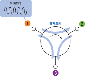 如图所示,从端子①进入的高频信号仅传输至端子②,进入端子②中的高频信号仅传输至端子③中。同时,进入端子③中的高频信号传输至端子①中。如此,仅以固定的方向进行传输,且不会逆向传输的方式。