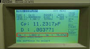 如果在电容器测量时测得的电压低于0.8 Vrms的下限时,则可能测得电容値低下。有些电容计(如:HP4284A)有电压和电流等级监视器(图2)。当这些功能“ON”时,电容器上的电压等级或通过电容器的电流会直接显示在仪器显示屏上,不需要再连接伏特计。提供给电容器电压与测定设备设定的电压等级可能完全不同,请注意。 图1:验证VAC