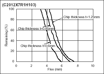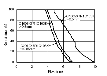 随着陶瓷部件尺寸的减少,客戸有更多种选择,就像相对于大砖,小砖更难于折断一样,小尺寸的MLCC提供的强度可満足市場的要求,就不需要开路模式的设计。作为一个示例,下面显示了作为元件尺寸一项功能的典型基板挠曲强度(图1和图2)。更小的几何体增加了MLCC的强度,且远超2mm EIA-198行业规格。