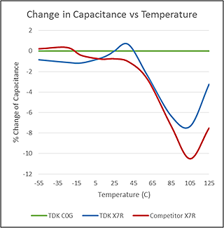 C0G以及NP0的种类1的电容器温度特性中,对于温度的变化并未发现静电容量有明显变化。