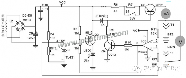 这样,接收单元的充电控制电路总耗电不到2mA。其中R4支路有1mA左右,Q3和Q4有0.5mA(Q3和Q4不会同时导通),IC2耗电更小(小于0.01mA)。