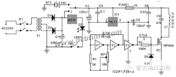 经继电器J选择的+24V直流电主要为发射线圈L1供电,此外,经IC1(78L12)降压后为集成电路IC2供电,为保证J的动作不影响发送电路的稳定工作,电容C2的容量不得小于2200uF。
