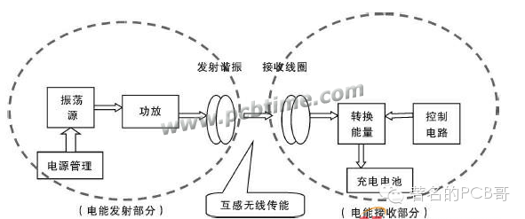 将直流电转换成高频交流电,然后通过没有任何有有线连接的原、副线圈之间的互感耦合实现电能的无线馈送。基本方案如图