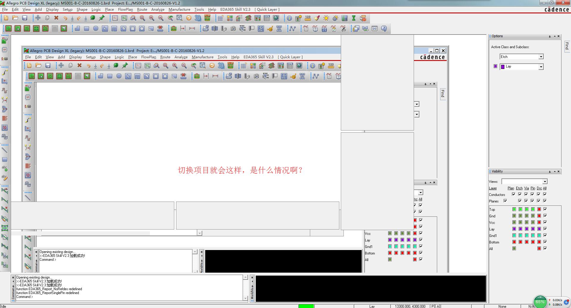 目前allegro还是可以正常使用,就是现在会出现切换界面或者点击Options/find命令栏都会白屏这个是怎么回事啊?怎么解决?如图下 这样切换allegro和orcad capture 和无语!求大师指定