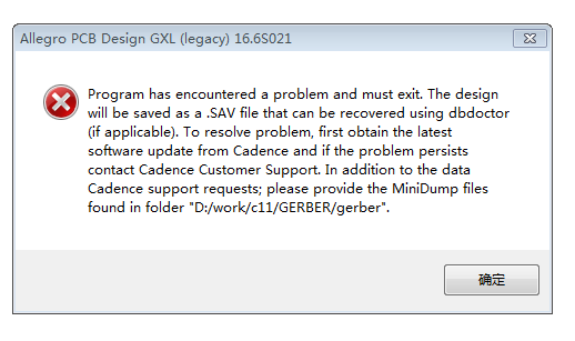 allegro 16.6 pcb文件打不开,出现program has encountered a problem and must exi...
