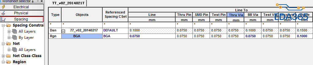 进入设计规则里面(CM),在设置间距spacing\region里面建一个bga间距区域规则(线宽规则在physical\region设置),如图片