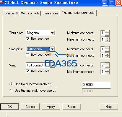 Shape--Global Dynamic shape Parameters 在Thermal relief connects中选择相应的参数就可以修改了