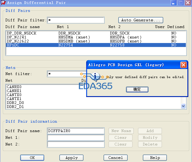 ERROR(SPMHNI-361): Diffpair 'HFSDC' is a electrically derived diffpair, cannot be changed.