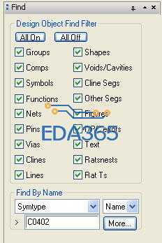 選擇display->element 後,在右邊TAB 的Find 最下方Find By Name 選Symtype,然後在下面輸入C0402,就會高亮所有C0402.