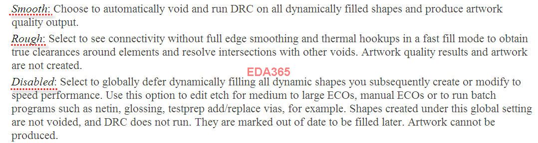 allegro 15.5中在setup--status选项中,最下边shapes(dynamic copper pour)下边fill mode 中有三个选项:smooth、rough、 disabled,分别是什么意思啊?有什么作用?