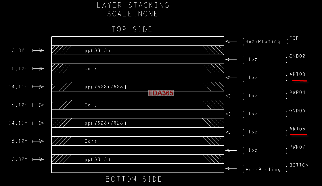 层叠结构:TOP布线--L2电源--L3地--L4布线--L5布线--L6地--L7电源--BOTTOM布线