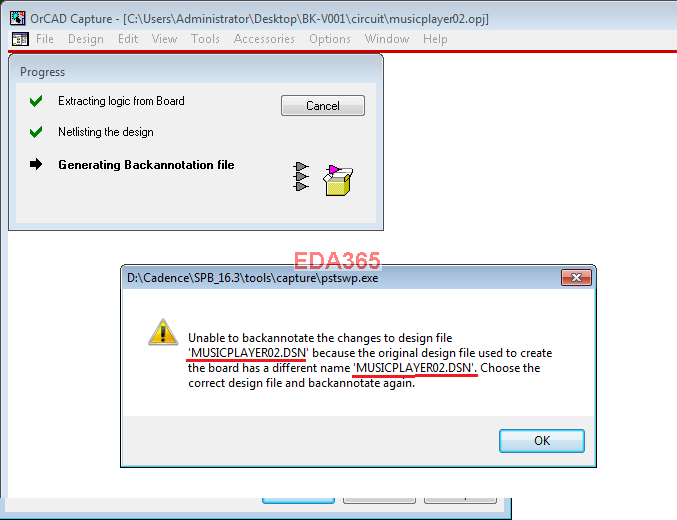 一般情况下我都回注不成功(有回注成功过),总是提示名称不一样. 仔细看了又看名称一样的啊我的PCB名称也是MUSICPLAYER02难道他指的不是PCB名称?