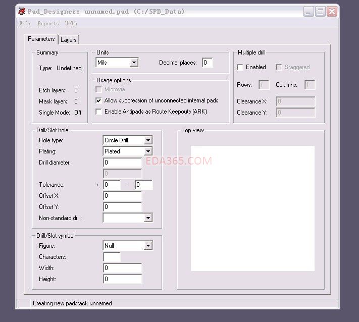 如果要设置SMD pad在drill里什么也不用填写,在layers中选择Single layer mode,就可以创建SMD pad否则是建立drill